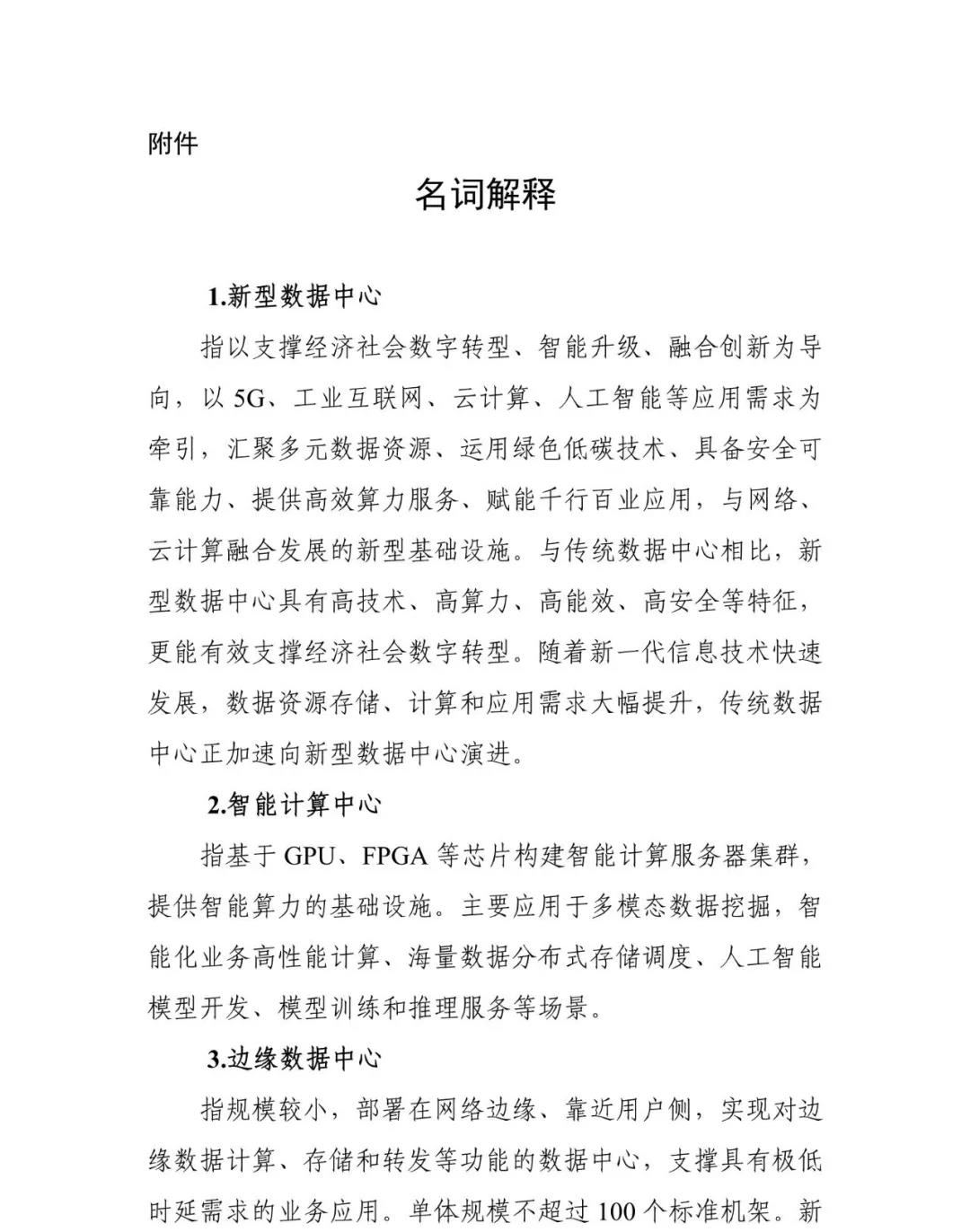 新型數(shù)據(jù)中心發(fā)展三年行動計劃 新型數(shù)據(jù)中心是以支撐經(jīng)濟(jì)社會數(shù)字轉(zhuǎn)型、智能升級、融合創(chuàng)新為導(dǎo)向,以5G、工業(yè)互聯(lián)網(wǎng)、云計算、人工智能等應(yīng)用需求為牽引,匯聚多元數(shù)據(jù)資源、運用綠色低碳技術(shù)、具備安全可靠能力、提供高效算力服務(wù)、賦能千行百業(yè)應(yīng)用的新型基礎(chǔ)設(shè)施,具有高技術(shù)、高算力、高能效、高安全特征。隨著新一代信息技術(shù)快速發(fā)展,數(shù)據(jù)資源存儲、計算和應(yīng)用需求大幅提升,傳統(tǒng)數(shù)據(jù)中心正加速與網(wǎng)絡(luò)、云計算融合發(fā)展,加快向新型數(shù)據(jù)中心演進(jìn)。為統(tǒng)籌推進(jìn)新型數(shù)據(jù)中心發(fā)展,構(gòu)建以新型數(shù)據(jù)中心為核心的智能算力生態(tài)體系,發(fā)揮對數(shù)字經(jīng)濟(jì)的賦能和驅(qū)動作用,制定本行動計劃。 以習(xí)近平新時代中國特色社會主義思想為指導(dǎo),全面貫徹黨的十九大和十九屆二中、三中、四中、五中全會精神,把握新發(fā)展階段、貫徹新發(fā)展理念、構(gòu)建新發(fā)展格局,以賦能數(shù)字經(jīng)濟(jì)發(fā)展為目標(biāo),推動新型數(shù)據(jù)中心建設(shè)布局優(yōu)化、網(wǎng)絡(luò)質(zhì)量提升、算力賦能加速、產(chǎn)業(yè)鏈穩(wěn)固增強、綠色低碳發(fā)展、安全保障提高,打造新型智能算力生態(tài)體系,有效支撐各領(lǐng)域數(shù)字化轉(zhuǎn)型,為經(jīng)濟(jì)社會高質(zhì)量發(fā)展提供新動能。 統(tǒng)籌協(xié)調(diào),均衡有序。堅持系統(tǒng)觀念,統(tǒng)籌存量和增量,加強數(shù)據(jù)中心規(guī)劃協(xié)調(diào),避免低質(zhì)量、粗放型建設(shè)發(fā)展。提升數(shù)據(jù)中心整體利用率,實現(xiàn)全國數(shù)據(jù)中心科學(xué)布局、有序發(fā)展。 需求牽引,深化協(xié)同。堅持市場需求導(dǎo)向,建用并舉。推動新型數(shù)據(jù)中心與網(wǎng)絡(luò)協(xié)同建設(shè),推進(jìn)新型數(shù)據(jù)中心集群與邊緣數(shù)據(jù)中心協(xié)同聯(lián)動,促進(jìn)算力資源協(xié)同利用,加強國際國內(nèi)數(shù)據(jù)中心協(xié)同發(fā)展。 分類引導(dǎo),互促互補。堅持多元主體共建原則,鼓勵不同主體在新型數(shù)據(jù)中心建設(shè)運營中發(fā)揮各自優(yōu)勢,推動基礎(chǔ)電信企業(yè)強化網(wǎng)絡(luò)等基礎(chǔ)設(shè)施建設(shè),引導(dǎo)第三方數(shù)據(jù)中心企業(yè)提供差異化、特色化服務(wù),支持互聯(lián)網(wǎng)企業(yè)創(chuàng)新行業(yè)應(yīng)用。 創(chuàng)新驅(qū)動,產(chǎn)業(yè)升級。堅持產(chǎn)業(yè)基礎(chǔ)高級化和產(chǎn)業(yè)鏈現(xiàn)代化,加強新型數(shù)據(jù)中心核心技術(shù)研發(fā),推動產(chǎn)業(yè)鏈協(xié)同創(chuàng)新,育龍頭、筑基礎(chǔ)、強集群,促進(jìn)產(chǎn)業(yè)發(fā)展水平和服務(wù)能力不斷提升。 綠色低碳,安全可靠。堅持綠色發(fā)展理念,支持綠色技術(shù)、綠色產(chǎn)品、清潔能源的應(yīng)用,全面提高新型數(shù)據(jù)中心能源利用效率。統(tǒng)籌發(fā)展與安全,進(jìn)一步強化網(wǎng)絡(luò)和數(shù)據(jù)安全管理和能力建設(shè),構(gòu)建完善的安全保障體系。 用3年時間,基本形成布局合理、技術(shù)先進(jìn)、綠色低碳、算力規(guī)模與數(shù)字經(jīng)濟(jì)增長相適應(yīng)的新型數(shù)據(jù)中心發(fā)展格局??傮w布局持續(xù)優(yōu)化,全國一體化算力網(wǎng)絡(luò)國家樞紐節(jié)點(以下簡稱國家樞紐節(jié)點)、省內(nèi)數(shù)據(jù)中心、邊緣數(shù)據(jù)中心梯次布局。技術(shù)能力明顯提升,產(chǎn)業(yè)鏈不斷完善,國際競爭力穩(wěn)步增強。算力算效水平顯著提升,網(wǎng)絡(luò)質(zhì)量明顯優(yōu)化,數(shù)網(wǎng)、數(shù)云、云邊協(xié)同發(fā)展。能效水平穩(wěn)步提升,電能利用效率(PUE)逐步降低,可再生能源利用率逐步提高。 到2021年底,全國數(shù)據(jù)中心平均利用率力爭提升到55%以上,總算力超過120 EFLOPS,新建大型及以上數(shù)據(jù)中心PUE降低到1.35以下。 到2023年底,全國數(shù)據(jù)中心機架規(guī)模年均增速保持在20%左右,平均利用率力爭提升到60%以上,總算力超過200 EFLOPS,高性能算力占比達(dá)到10%。國家樞紐節(jié)點算力規(guī)模占比超過70%。新建大型及以上數(shù)據(jù)中心PUE降低到1.3以下,嚴(yán)寒和寒冷地區(qū)力爭降低到1.25以下。國家樞紐節(jié)點內(nèi)數(shù)據(jù)中心端到端網(wǎng)絡(luò)單向時延原則上小于20毫秒。 (一)新型數(shù)據(jù)中心建設(shè)布局優(yōu)化行動 1.加快建設(shè)國家樞紐節(jié)點。推動京津冀、長三角、粵港澳大灣區(qū)、成渝等國家樞紐節(jié)點適當(dāng)加快新型數(shù)據(jù)中心集群建設(shè)進(jìn)度,實現(xiàn)大規(guī)模算力部署,滿足重大區(qū)域發(fā)展戰(zhàn)略實施需要;貴州、內(nèi)蒙古、甘肅、寧夏等國家樞紐節(jié)點重點提升算力服務(wù)品質(zhì)和利用效率,打造面向全國的非實時性算力保障基地。 2.按需建設(shè)各省新型數(shù)據(jù)中心。國家樞紐節(jié)點以外的地區(qū),著力整合并充分利用現(xiàn)有數(shù)據(jù)中心資源,加快提高存量數(shù)據(jù)中心利用率。