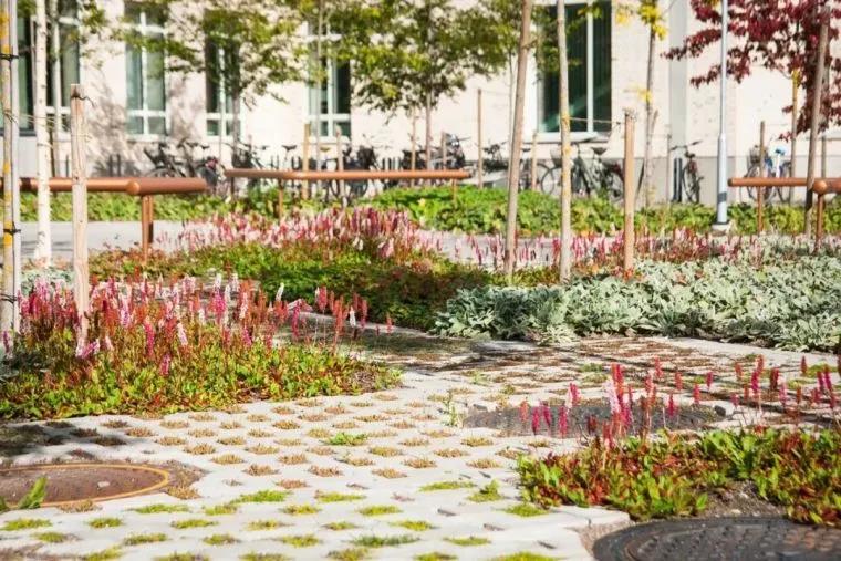 位于主入口處的植物園廣場(chǎng)種植了多種樹木,連同種植的鋪路路縫、戲謔的樹木和水等元素,共同構(gòu)成了