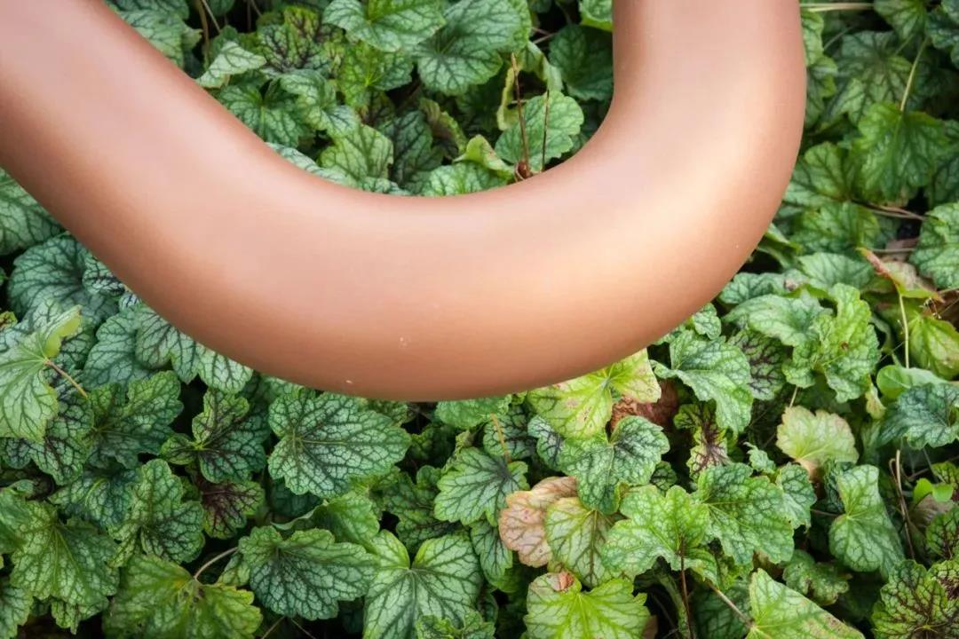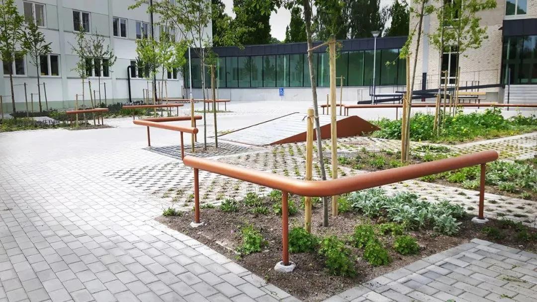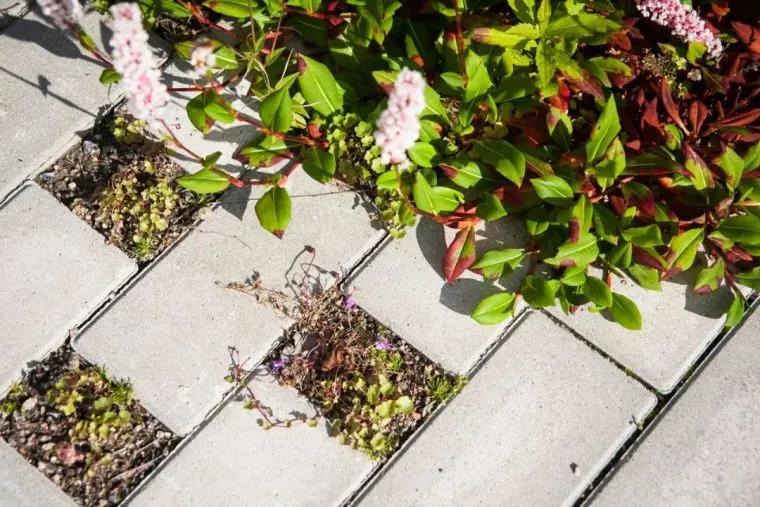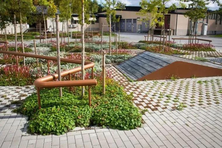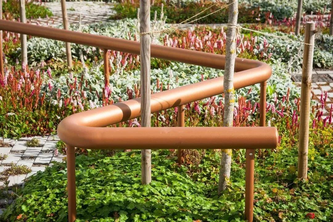 在軟硬鋪裝結(jié)合的基礎(chǔ)上,植物區(qū)與純鋪裝的阻攔部分采用銅色管狀阻隔物。銅色是溫暖的顏色,有利于