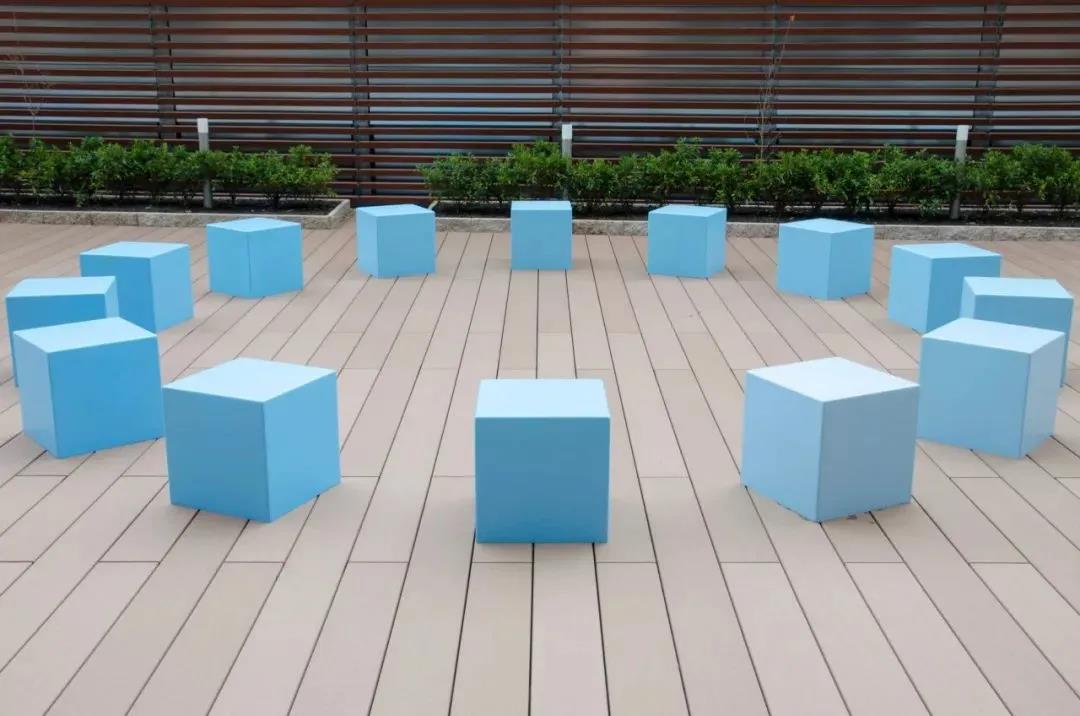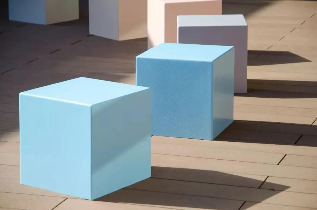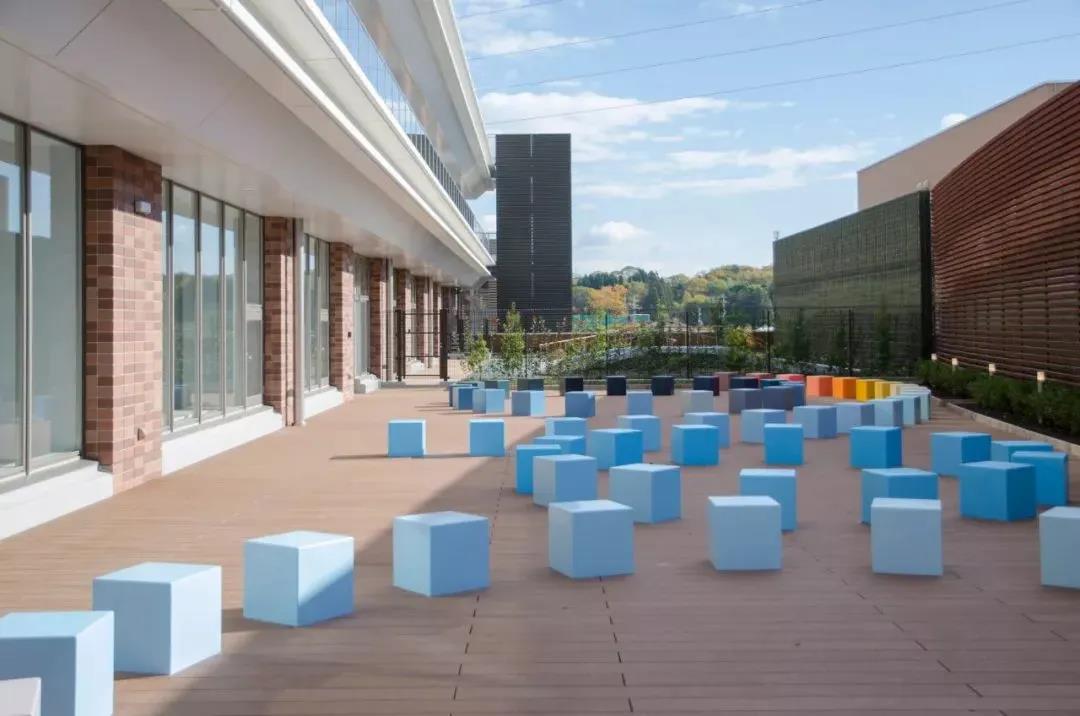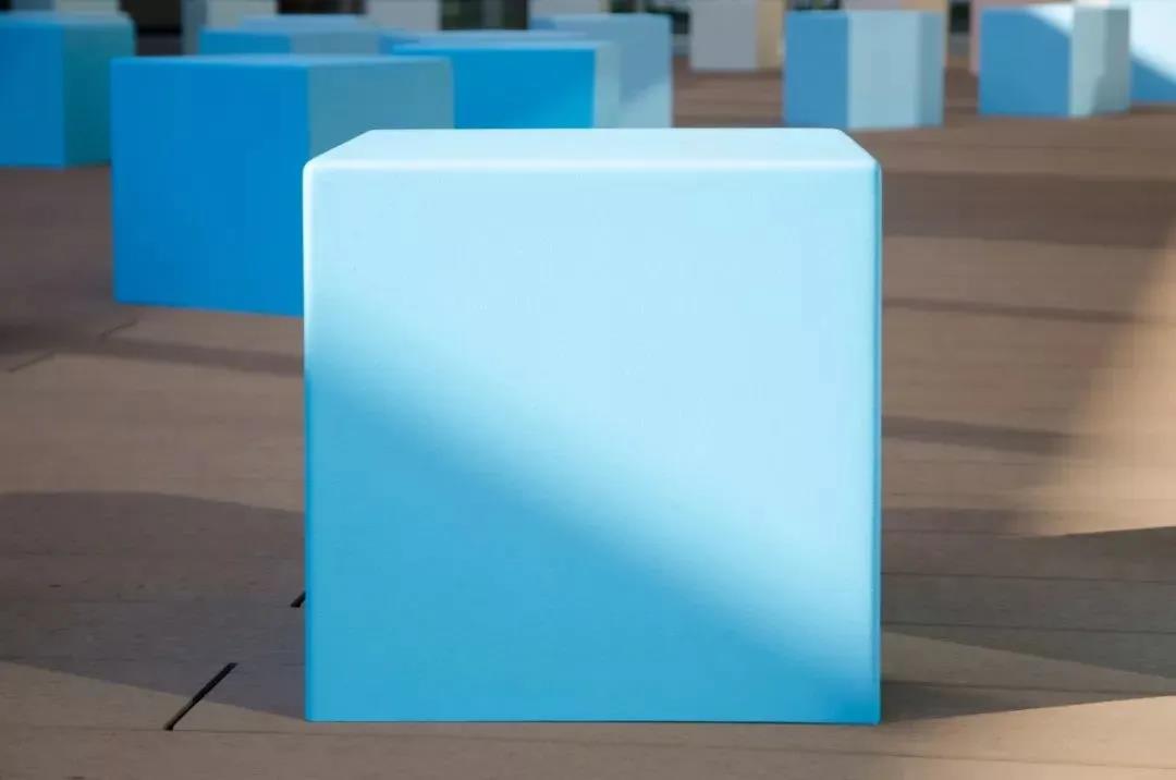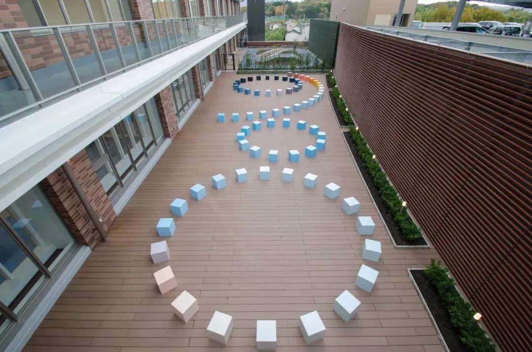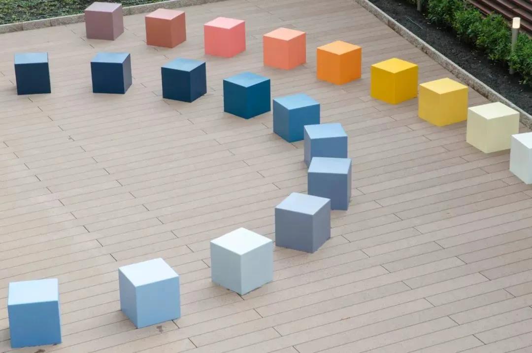 五顏六色的長(zhǎng)凳在露天陳設(shè),你可以在一所新的大學(xué)醫(yī)院大樓的屋頂花園里找到它們。這些立方體形狀的