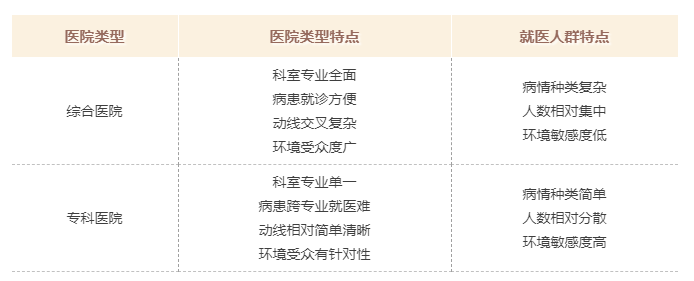 不同的醫(yī)院類(lèi)型在就醫(yī)人群和醫(yī)院整體設(shè)計(jì)上有著不同的特征,但是由于運(yùn)維管理、室內(nèi)設(shè)計(jì)等多方面的原因,很多患者出現(xiàn)在綜合醫(yī)院看病流程繁瑣、醫(yī)院環(huán)境惡劣的就醫(yī)體驗(yàn),而專(zhuān)科醫(yī)院雖然相對(duì)就醫(yī)環(huán)境較好,但高價(jià)格也給老百姓造成了心理壓力。