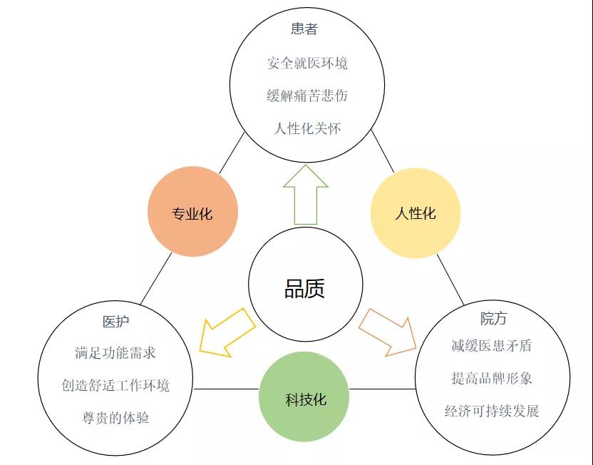 醫(yī)院的最終目的是為病人、家屬以及醫(yī)務(wù)人員提供更好的服務(wù)品質(zhì),好的醫(yī)院室內(nèi)設(shè)計(jì)必須具備“四化”,即專(zhuān)業(yè)化、人性化、科技化和尊貴化,主要通過(guò)公共空間和科室空間兩個(gè)大的方面來(lái)設(shè)計(jì)體現(xiàn)。