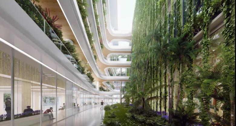 花園式醫(yī)院追求綠意盎然自然治愈,讓空間充滿生機(jī)和活力。主要通過(guò)內(nèi)裝設(shè)計(jì)來(lái)打造,可以采用局部綠植墻點(diǎn)綴空間,合理利用采光中庭及庭院,實(shí)現(xiàn)室內(nèi)室外借景,也可以局部植入綠植景觀小品,增強(qiáng)細(xì)節(jié)感。