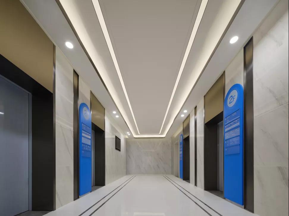 ▲ 圖45 人性化/專(zhuān)業(yè)化/尊貴化:醫(yī)技樓電梯廳采用易于引導(dǎo)標(biāo)識(shí)系統(tǒng)、防炫光暗藏?zé)艄?、采用石材和不銹鋼材質(zhì)品質(zhì),體現(xiàn)空間品質(zhì)感特性