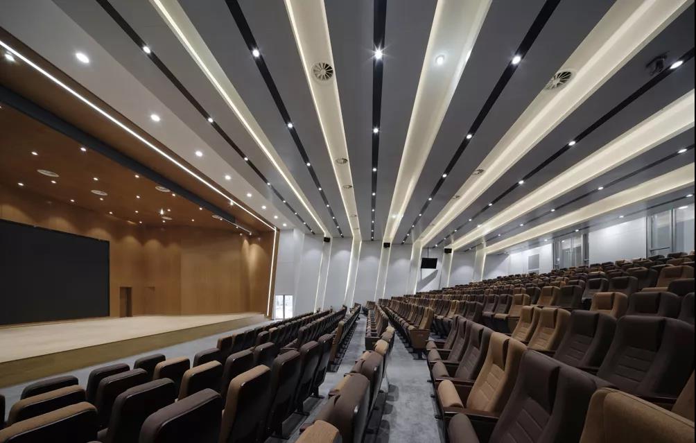▲ 圖51 專(zhuān)業(yè)化/尊貴化:綜合樓報(bào)告廳采用線性燈光氛圍、主舞臺(tái)采用木色色調(diào)