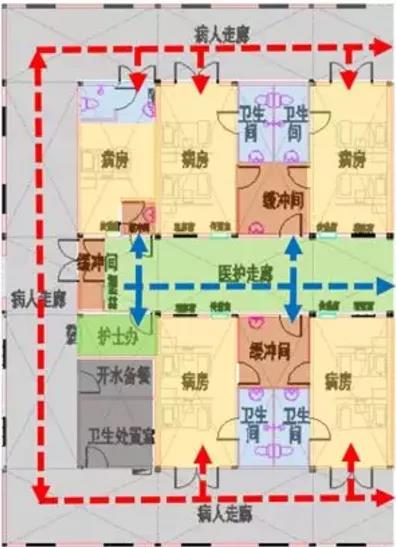 下面是武漢火神山醫(yī)院的局部病房平面圖,紅色虛線表示的是患者流線,藍(lán)色虛線表示的是醫(yī)生流線,兩種流線沒有交叉。