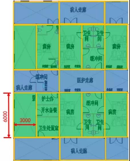 下面是火神山醫(yī)院的局部平面圖,可以看出,若干個6m*3m的模塊化尺寸通過水平與垂直方向不同的組合方式,形成了病房、衛(wèi)生間、緩沖間、病人走廊、醫(yī)護(hù)走廊等等不同的功能分區(qū),基本解決了傳染病醫(yī)院的流線及分區(qū)問題。