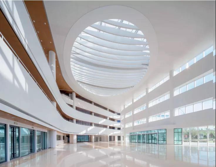 由于院區(qū)用地呈不規(guī)則的梭形,且用地處于西側(cè)城市主要交通與東側(cè)居住區(qū)的過渡區(qū)域,方案創(chuàng)新性地引入“城市客廳”的設(shè)計理念,用地中心位置的開敞共享公共大廳不僅作為與城市、居住區(qū)進行空間對話的形象節(jié)點,而且將整個院區(qū)各功能自然地整合在一起。