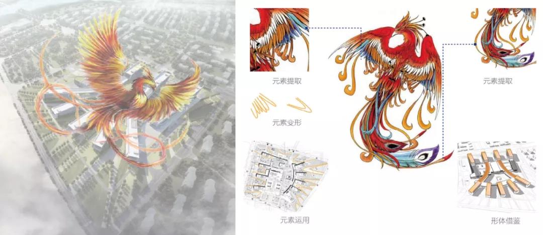 日出東方、火鳳騰飛——方案延續(xù)當(dāng)?shù)貙?duì)太陽(yáng)的崇拜及鳳凰城遺址的歷史文化積淀,取意象征太陽(yáng)的神鳥(niǎo)鳳凰,將鳳凰羽翼和尾翼的線(xiàn)條進(jìn)行提煉演變,形成建筑和景觀的構(gòu)成元素,表達(dá)了對(duì)歷史和文化的呼應(yīng)。